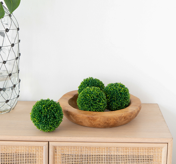 Boasting the lush, verdant color of live boxwood, this set of artificial spheres blends elegance and simplicity to provide a versatile look that fits into any interior style. Pile them into a decorative bowl, tray, or vase and instantly infuse your home decor with a touch of nature.
