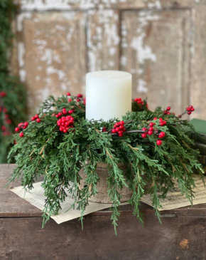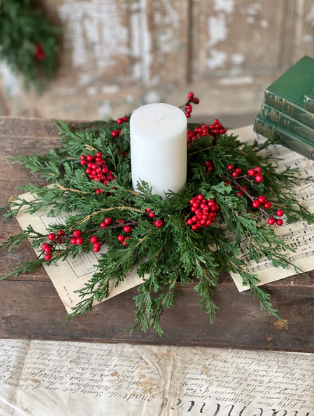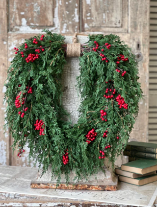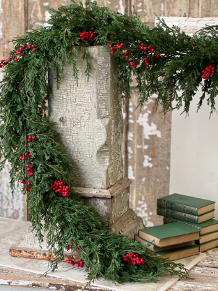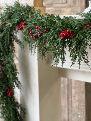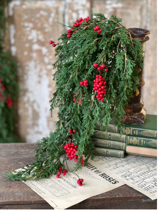 Emerald Falls with berries adds a zest of festivity with its gorgeous soft touch greenery that has a draping nature and verdant color with contrasting pops of red in berry clusters and sprigs.