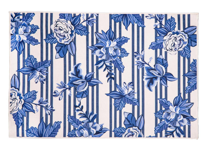 Chinoiserie Bow Blue Floral Strip Washable Mat
