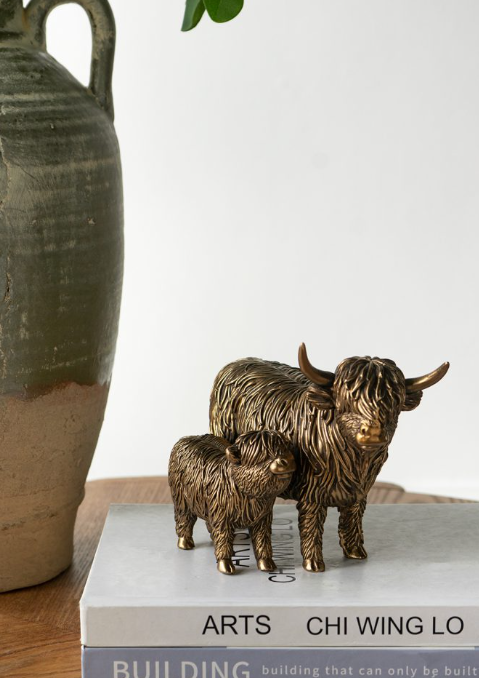 Transforming the rugged beauty of the Scottish Highland cow into a charming home accent, this figurine captures a tender moment between mother and calf, standing side by side in harmony. Finished in antique bronze with intricate detailing across their fur, horns, and hooves, it is sure to draw the eye whether displayed on its own or as part of a playful animal-themed ensemble.