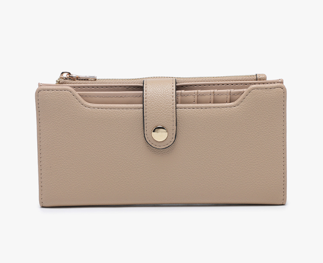 The Violet Wallet delivers versatile organization in a fold-out design. Featuring a snap closure and top zip pocket, it includes multiple card slots, slip pockets, and an ID window, along with a removable card holder for added functionality.